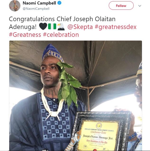 His supermodel girlfriend, Naomi Campbell who is in Nigeria with him, took social media to congratulate him on his Chieftaincy title.